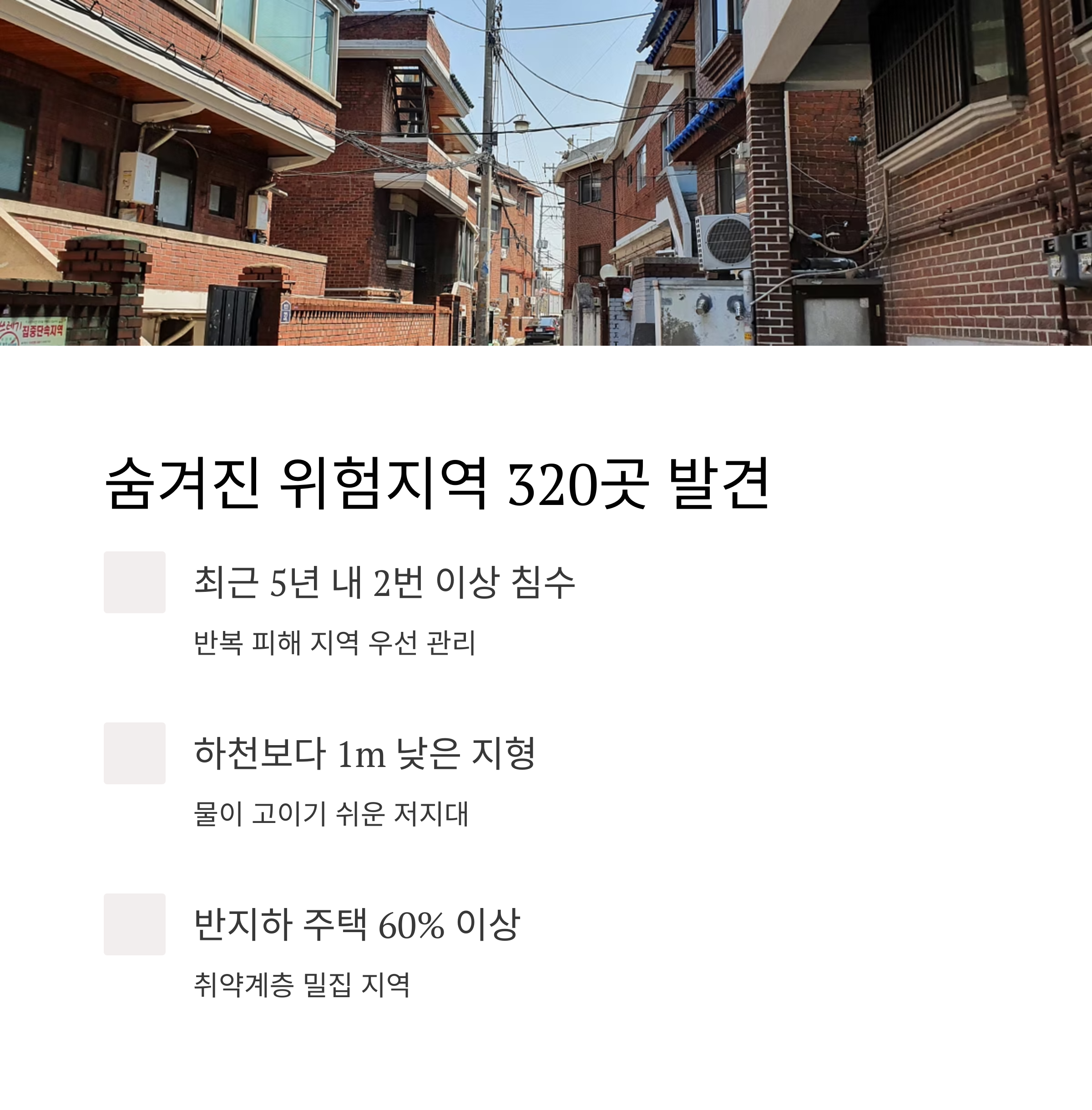 **"더 이상 기다릴 수 없다"**는 판단 하에, 2025년부터 침수와 붕괴 위험이 높은 지역 320여 곳을 집중 관리하기로 했거든요.