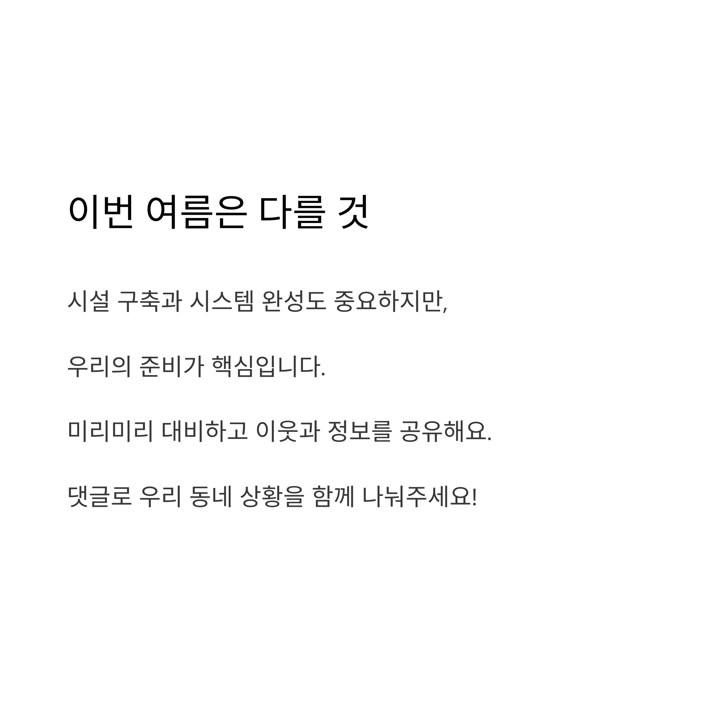 혼자서는 한계가 있어요. 특히 반지하나 지하층에 사는 이웃들과는 미리 비상 계획을 세워두는 게 좋겠어요.