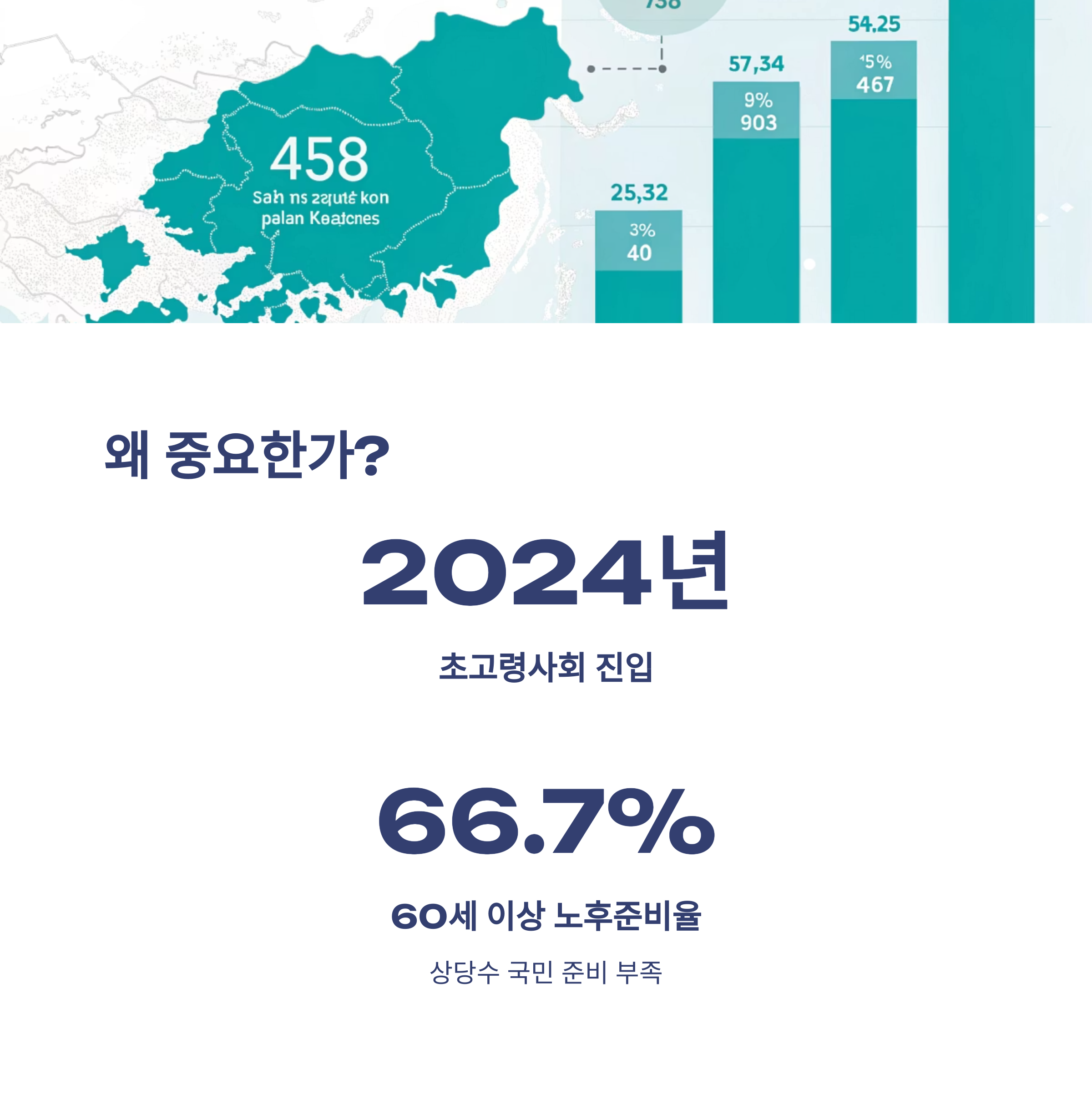 우리나라는 2024년 12월 기준으로 초고령사회에 진입하였으며, 통계청의 2023년 사회조사에 따르면 60세 이상 인구의 노후준비율은 66.7%에 불과합니다. 이는 상당수의 국민이 노후에 대한 준비가 부족하다는 것을 의미하며, 이에 따라 정부는 통합적 노후지원 체계를 마련하여 국민의 안정된 노후생활을 지원하고자 합니다.
