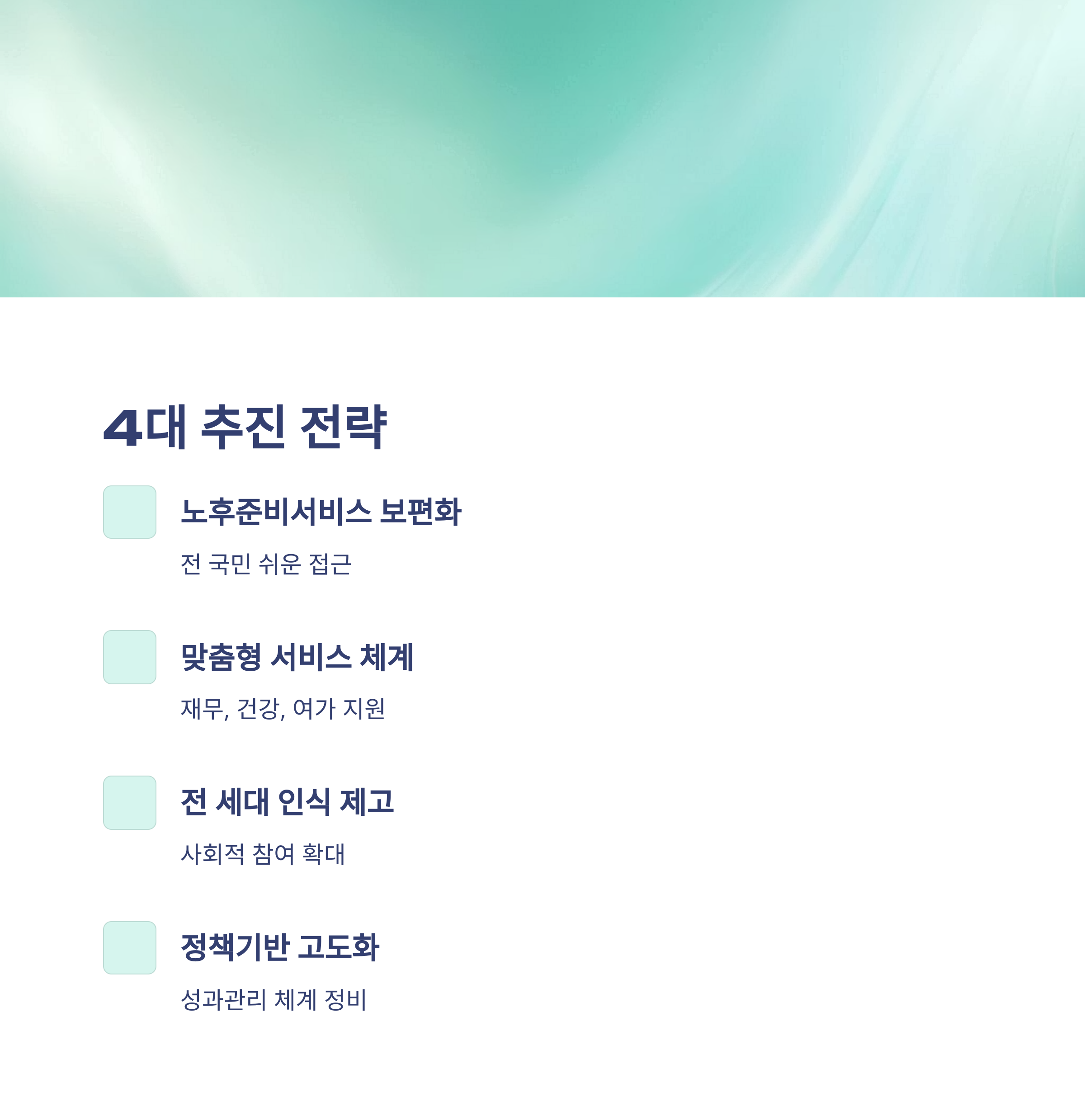 | 생애주기·영역별 맞춤형 서비스 체계 고도화 | 재무, 건강, 여가 등 생애 전반에 걸친 맞춤형 지원 |